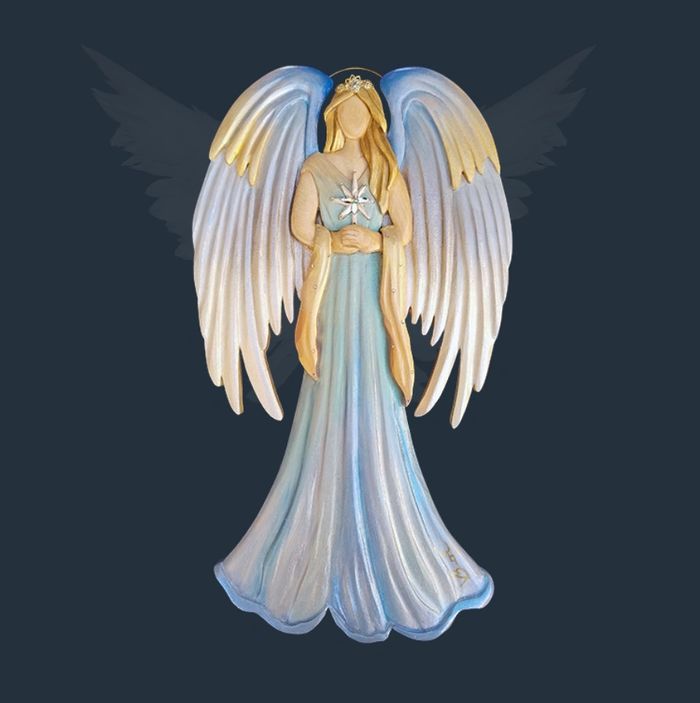 We own Miranda, a beautiful angel that adorns our living room wall and graces our home. Her wings reflect sunlight and she looks different each day.